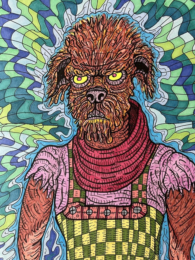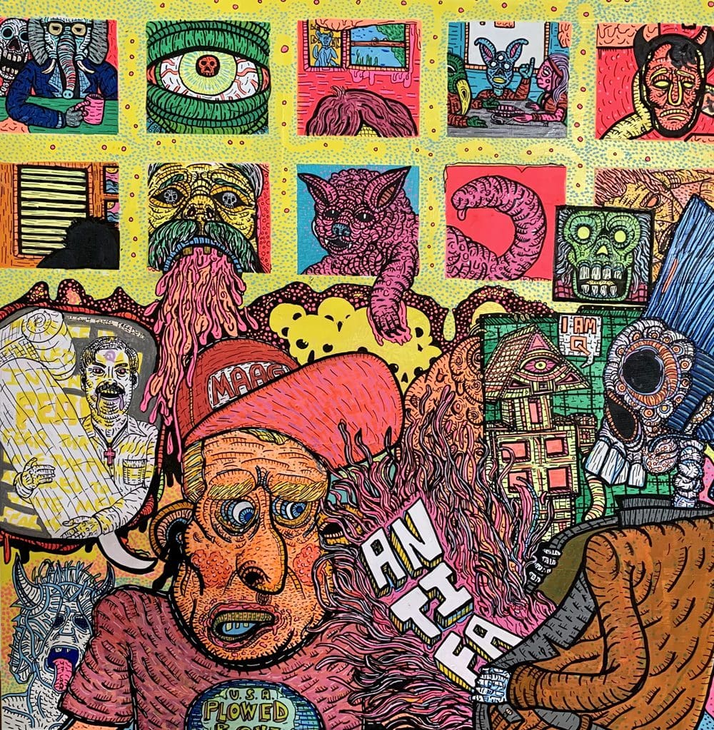 Company Meeting combines paintings and drawings created during the great upheaval of the 2020s. Grotesque, cartoonish figures twist, explode, and bend backwards into psychedelic eruptions of color, pattern, and detail. Sandagata’s works critique and question, melding elements of pop culture, 80s comics, countercultural movements, punk, heavy metal, chronic illness, politics and contemporary art into a visual riot.