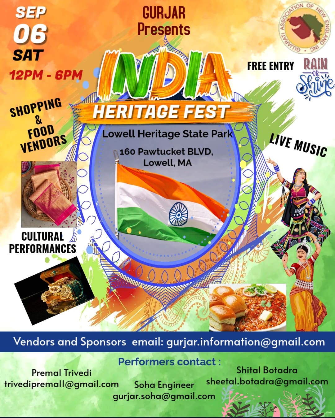 GURJAR proudly presents the annual INDIA HERITAGE FEST at Lowell Heritage State Park. Experience the vibrant sights, sounds, and flavors of India, right here in Massachusetts! Shop ethnic wear, jewelry, décor & more. Savor delicious Indian food and enjoy live music, dance, and cultural shows at the Sampas Pavilion.