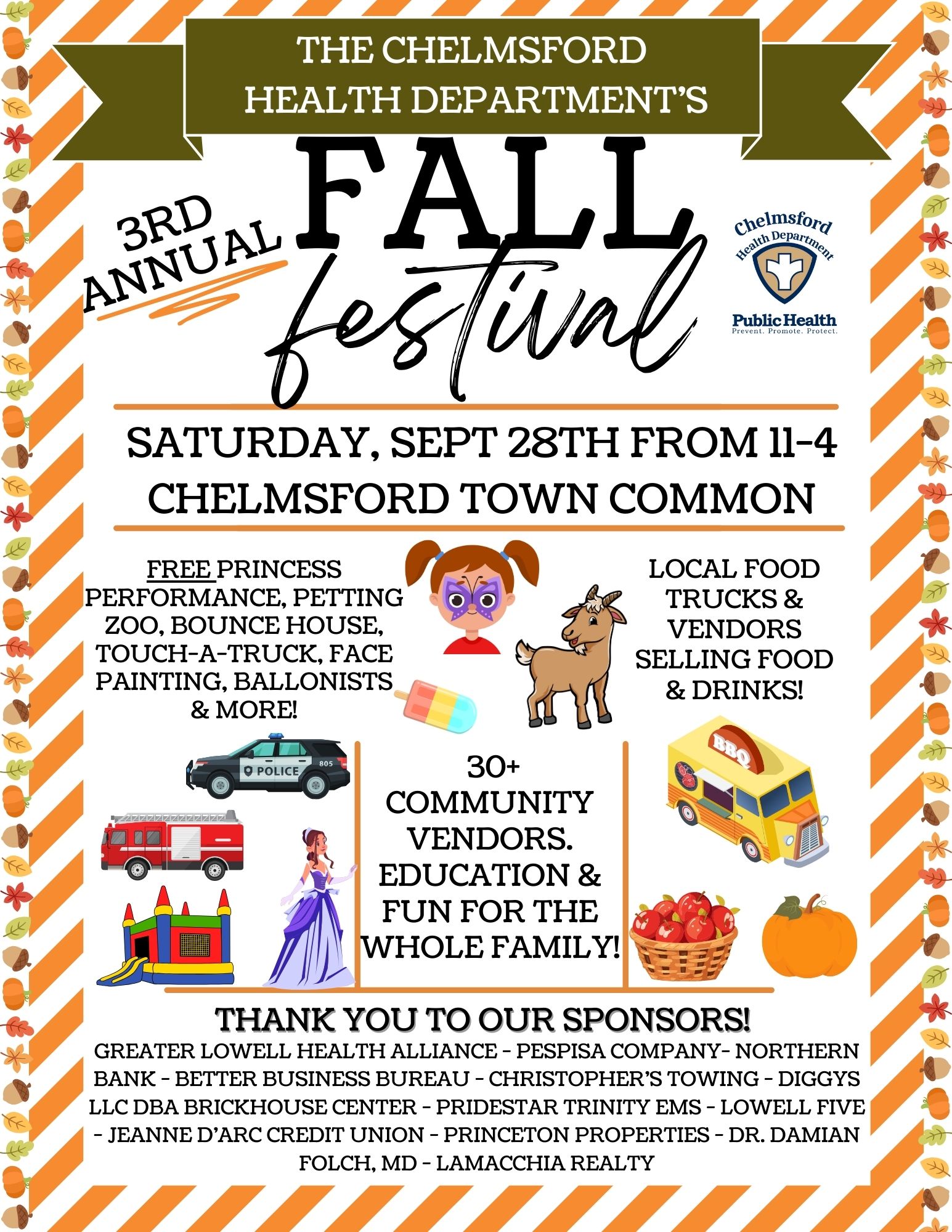 The Chelmsford Board of Health presents the Fall Festival on Saturday, September 28, from 11:00 AM- 4:00 PM on the Town Common. Enjoy a fun autumn day and meet a princess or a superhero from Party Palace! Or visit the petting zoo and touch a truck! The event will provide you with music, food, drinks, […]