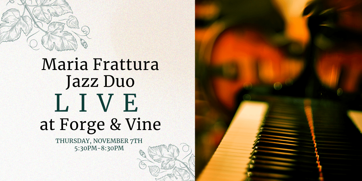 Join us for an evening filled with smooth jazz, delicious seasonal dining, handcrafted cocktails, and more at Forge & Vine! Live music by the talented Maria Frattura Duo is from 5:30pm-8:30pm. Reservations are encouraged and available at Forge & Vine's OpenTable page or over the phone at 978-448-9200.
