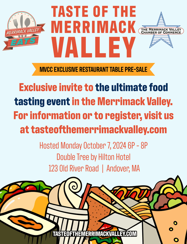 The Merrimack Valley Chamber of Commerce and Merrimack Valley Eats Presents: Taste of the Merrimack Valley on Monday, Oct 7th from 6pm-8pm at the Double Tree by Hilton Hotel, Andover, MA.