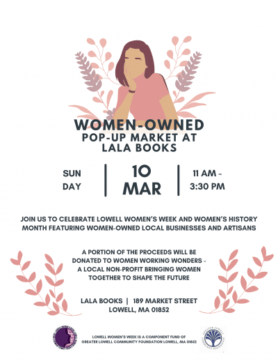 Join us to celebrate Lowell women’s week and women’s history month featuring women-owned local businesses and artisans. A Portion of the proceeds will be donated to Women Working Wonders, a local non-profit bringing women together to shape the future.