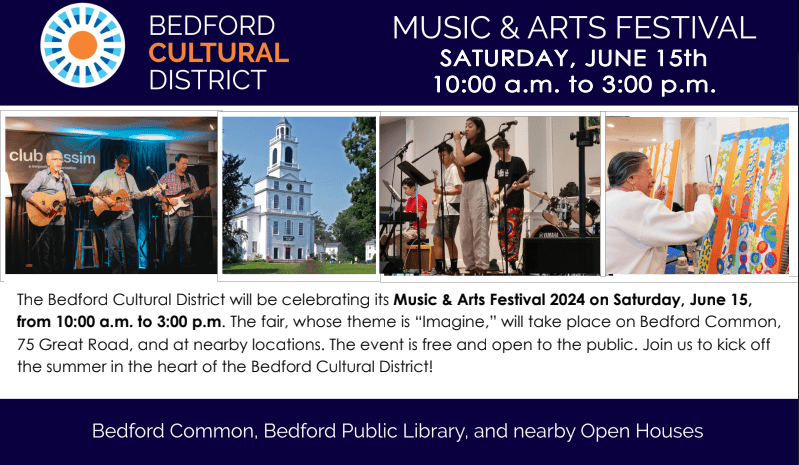 The Bedford Cultural District Partnership (BCDP) will be holding a Music & Arts Festival 2024 on Saturday, June 15th, on the Bedford Common (75 Great Road). Entertainment, education, and fun for all ages. Features diverse musical groups performing during the day, interactive art projects, open houses, local community booths, activities for kids and adults, and […]