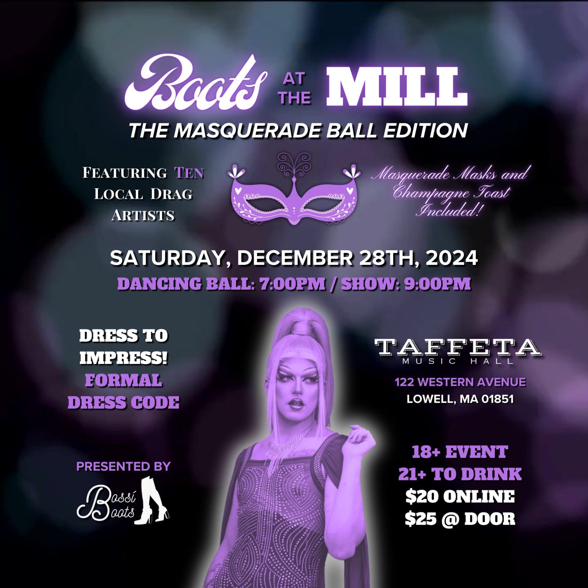 🎭 MASQUERADE BOOTS! 🎭 Boots at the Mill is throwing a Masquerade Ball! 💃🎊 Join us on Saturday, December 28th, 2024 starting at 7:00pm for a formal ball on the dance floor, with a champagne toast from hostess Bossí Boots! 🍾 Then, at 9:00pm, our iconic drag show will begin featuring headliner Just JP! Additionally, Pathway […]