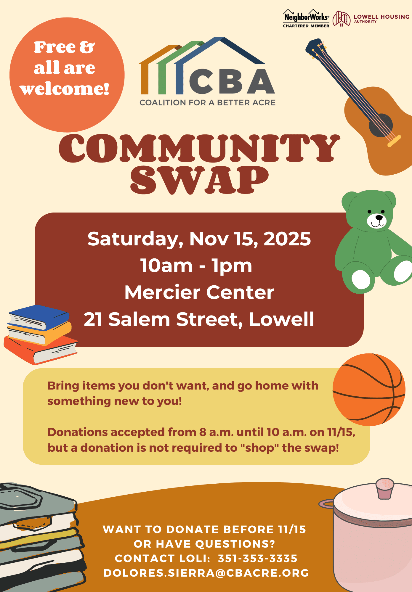 Bring something, take something! An opportunity for local residents to drop off gently used items (clothes, household items, etc.) that are no longer wanted and find items donated by others. All free of cost. Location: Mercier Center 21 Salem St, Lowell MA Contact: Dolores Sierra dolores.sierra@cbacre.org 351-353-3335 ¡Trae algo, lleva algo! Una oportunidad para que […]
