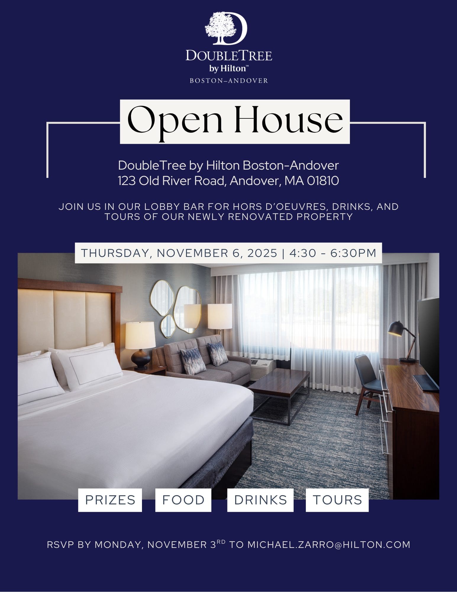 You’re Invited: Experience the Newly Renovated DoubleTree by Hilton Boston - Andover Join us in our lobby bar for hors d'oeuvres, drinks, and tours of our newly renovated property!