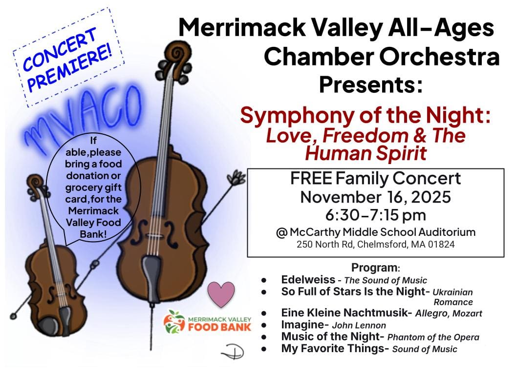 Free family concert premiere for MVACO! We will also collect donations for the Merrimack Valley Food Bank. String players from 6th grade to adult, and all levels! Come hear them astound you! |